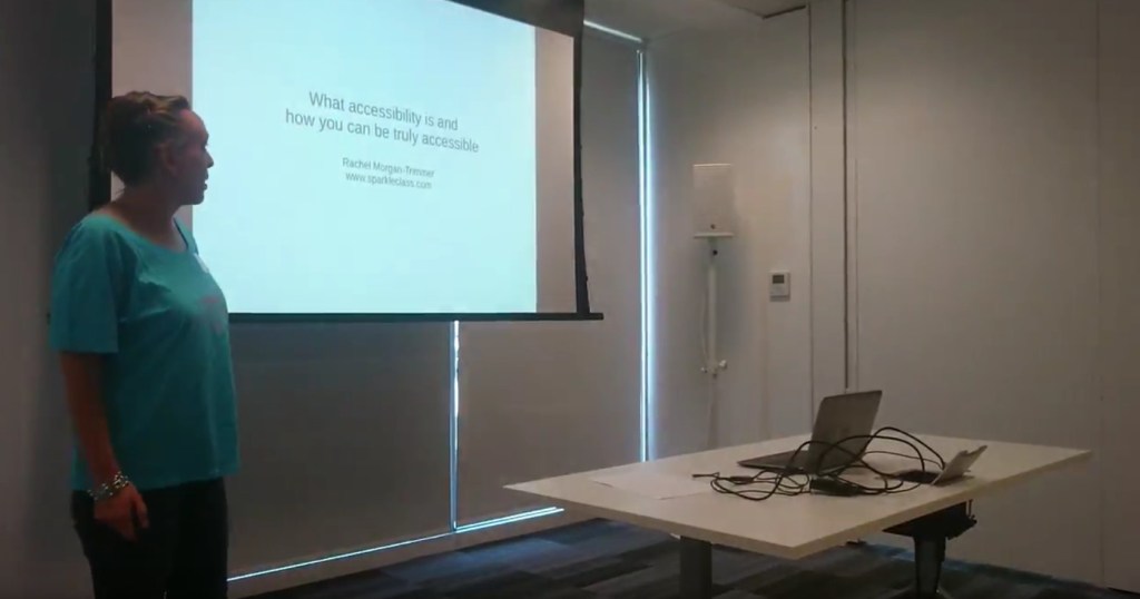 I chose the second session of the day to do my talk because I wanted to get it over with. It was “What accessibility really is, and how you can be truly accessible” which regular listeners may remember I did at Upfront earlier this year. I was helped with the set-up by Ether Alak who managed to hide his disgust that I didn’t know how to press “Fn + F1” and rescued from embarrassment by Colette Weston, who fished an HDMI adaptor out of her bag just in time. The lovely Luce provided me with a clicker. (I love a clicker, it makes me feel like a proper grown-up speaker). Lorna Mitchell filmed a bit of the talk for me. Here is a still: