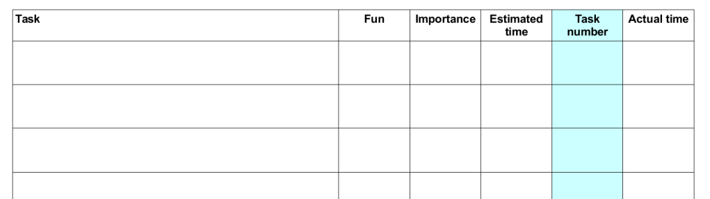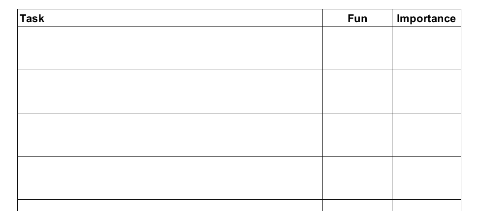 You list your tasks, then you assign each two numbers. One is for how fun a task is, and the other is for how important it is. I rank them out of 5, but you can choose your own system. 5 is good because it’s quick and easy and it doesn’t matter if two items have the same number.