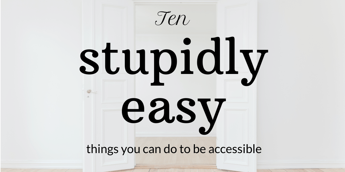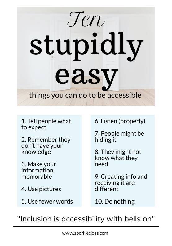 One of my favourite accessibility tips is to put a picture of the door to your building on your website. It helps everybody who’s coming to visit you arrive on time and in a calmer mood – especially if it’s raining!
