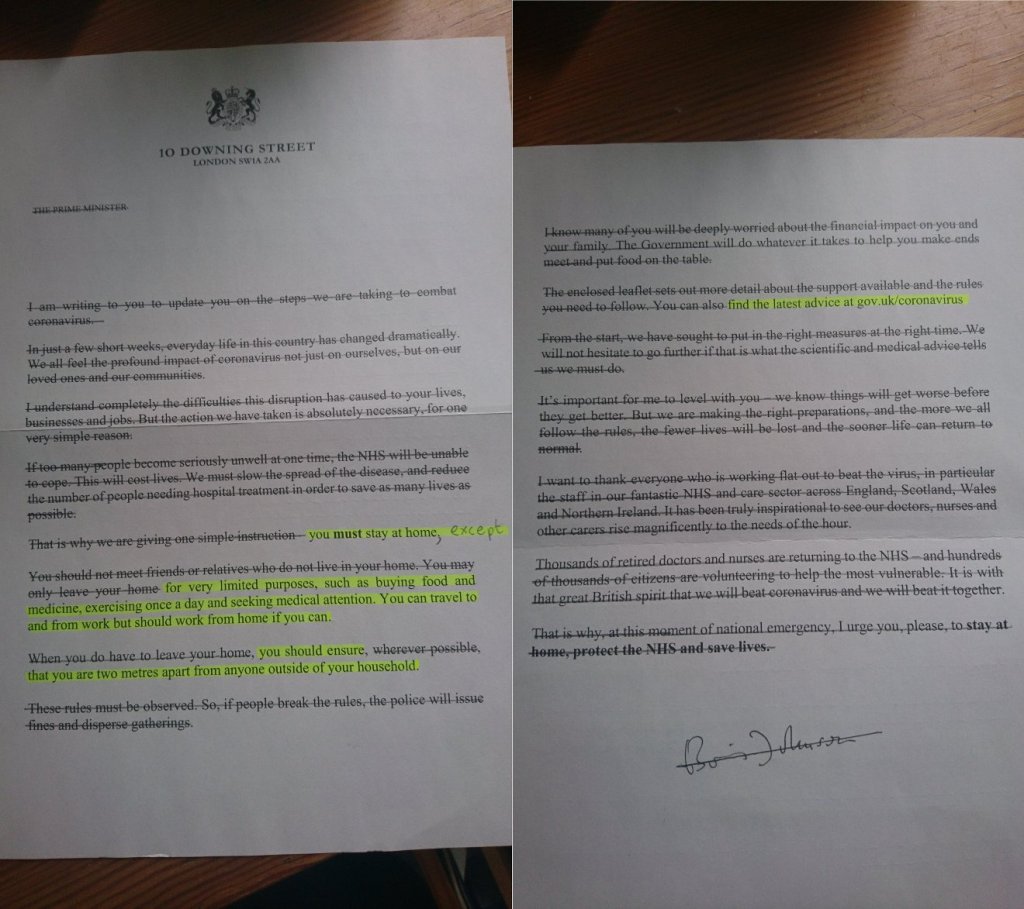Here’s the letter the UK government sent out about the corona virus. I highlighted all the information that was necessary and crossed out everything else. You can see how hard it is to find what you need when there are so many unnecessary words to wade through.