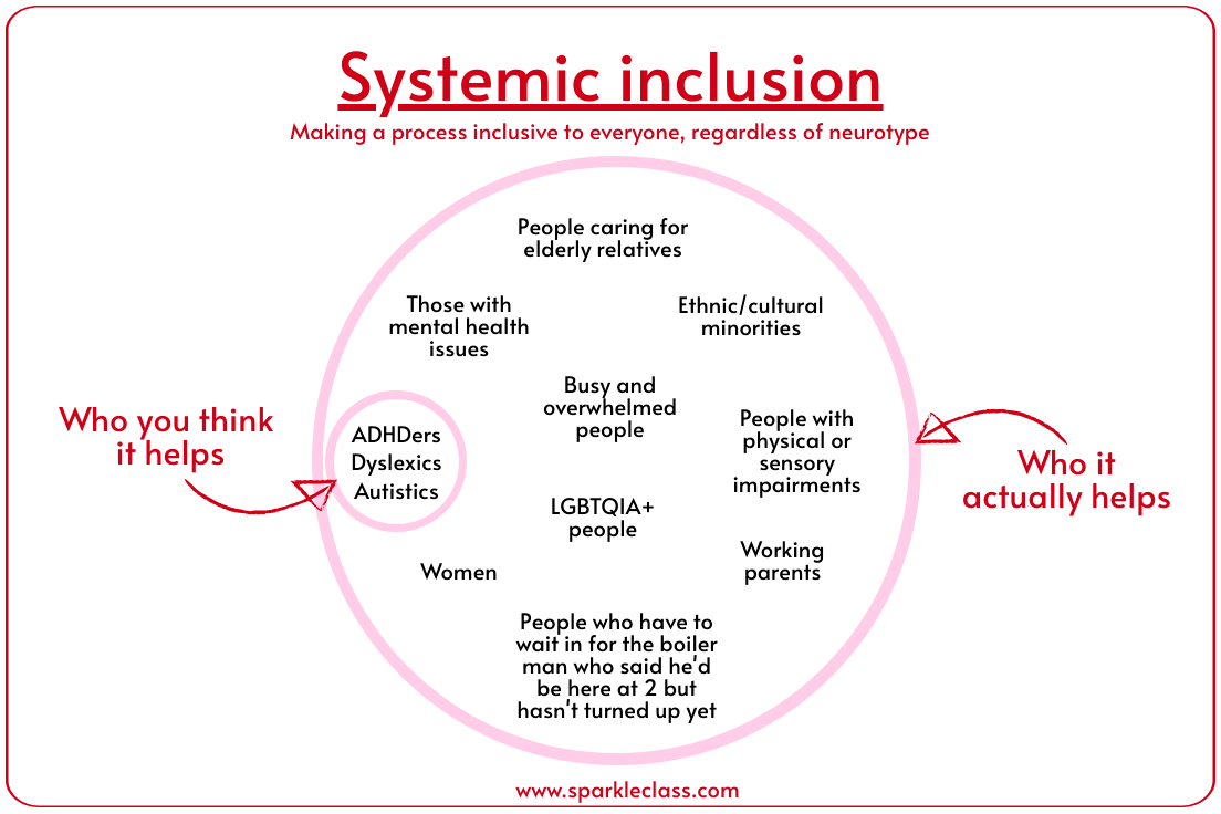 I use it here in the context of neurodiversity. How can you implement systemic inclusion so that people with ADHD, autism, dyslexia, dyspraxia or dyscalculia can access what you need?